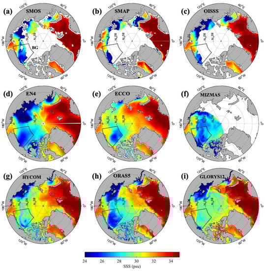 SMOS BEC V3.1 3day data at 25km resolution were produced by the Barcelona Expert Centre (http://bec.icm.csic.es, accessed on 3 April 2021) a joint initiative of the Spanish Research Council (CSIC) and Technical University of Catalonia (UPC), mainly funded by the Spanish National Program on Space and is available through a secure FTP server: sftp://becftp.icm.csic.es:27500, accessed on 4 April 2021. SMAP SSS V4.0 Level 3 is a 0.25° gridded product with 8–day running mean salinity data obtained from RSS (www.remss.com/missions/smap/salinity/), accessed on 3 April 2021. Multi-mission OISSS 4–day 0.25° L4v1 gridded salinity data were downloaded from the JPL/PO.DAAC drive (https://podaac.jpl.nasa.gov/dataset/OISSS_L4_multimission_7day_v1), accessed on 10 September 2021. SIZRS data is provided by the Polar Science Center along the 150°W transect on monthly expeditions anywhere between May and October 2012–2017 (http://psc.apl.uw.edu/research/projects/sizrs/data-2/), accessed on 6 April 2021. The Woods Hole Oceanographic Institution (WHOI) Beaufort Gyre Exploration Project (BGEP) provides monthly observations from CTD casts along the BG 150°W transect (https://www2.whoi.edu/site/beaufortgyre/data/ctd-and-geochemistry/), accessed on 3 June 2021. EN.4.2.1 monthly salinity data at a 1° horizontal resolution with 42 vertical layers since 1900 were obtained from https://www.metoffice.gov.uk/hadobs/en4/, accessed on 20 April 2021, and are © British Crown Copyright, Met Office, provided under a Non–Commercial Government License (http://www.nationalarchives.gov.uk/doc/non-commercial-government-licence/version/2/), accessed on 3 April 2021. ECCO v4r4 daily salinity data with an LLC90 grid special resolution between 22 km–110 km were downloaded from the JPL/PODAAC ECCO drive (https://ecco.jpl.nasa.gov/drive/files/Version4/Release4/nctiles_daily), accessed on 22 February 2021. MIZMAS daily 3D salinity data with 40 depth layers were provided through a private server with a horizontal resolution of about 20 km, accessed on 23 July 2021. Daily SSS data from HYCOM + CICE is averaged from 12–h data and obtained from coupled on the same 1/12° global tripole grid and obtained from OPeNDAP framework (https://www.hycom.org/dataserver), accessed on 16 April 2021. ORAS5 monthly salinity data were taken from the University of Hamburg at 0.25° resolution and are available from 1993–2019 (https://icdc.cen.uni-hamburg.de/thredds/catalog/ftpthredds/EASYInit/oras5/ORCA025/vosaline/catalog.html) accessed on 13 April 2021. Daily salinity data from GLORYS12 version 1 with a 1/12° horizontal resolution and 50 vertical depth levels are available by the CMEMS server from 1993–2019 (ftp://my.cmems-du.eu/Core/GLOBAL_REANALYSIS_PHY_001_030/global-reanalysis-phy-001-030-daily), accessed on 3 April 2021.
