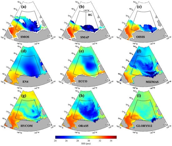 Arctic Ocean sea surface salinity (SSS) averaged over the month of September 2015 in the Beaufort Gyre (BG) region derived from satellites: (a) SMOS, (b) SMAP, (c) OISSS, objective analysis product: (d) EN4, and ocean model simulations: (e) ECCO, (f) MIZMAS, (g) HYCOM, (h) ORAS5 and (i) GLORYS12. 150°W transect is outlined for comparisons in this study.