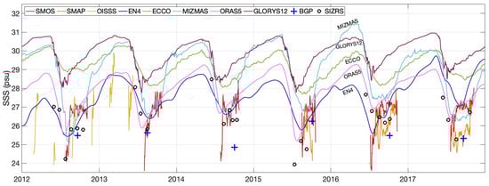 We used SMOS produced by BEC, which, as Xie et al. [] shows, has a lower bias relative to in situ data in the BG area than alternative SMOS products. Despite having a lower temporal and spatial resolution than SMOS, SMAP showed more promising outcomes than SMOS along the BG 150°W transect, where it has a lower salinity bias than SIZRS data [,,]. Bingham et al. [] found higher bias in SMOS BEC than in SMAP and EN4. Fournier et al. [] said that SMAP RSS and SMOS BEC had lower RMSD relative to in situ than other SMAP and SMOS products. Between the satellite products, SMOS BEC had the lowest positive bias of (0.08). When comparing missions between 60°S–60°N, Bao et al. [] found a higher bias in SMOS (−0.113) than SMAP (−0.078). Nonetheless, satellites show small SSS correlation values compared with SIZRS observations, most likely due to the small sample size and low spatial coverage obtained.