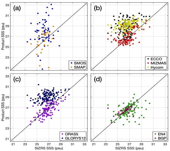 Scatter diagrams of sea surface salinity (SSS) of SIZRS (2 m) to (a) satellite missions, and of SIZRS (5 m) to (b,c) ocean model simulations, and (d) in–situ observations during SIZRS AXCTD drops. Black line signifies equivalent salinity values (psu).