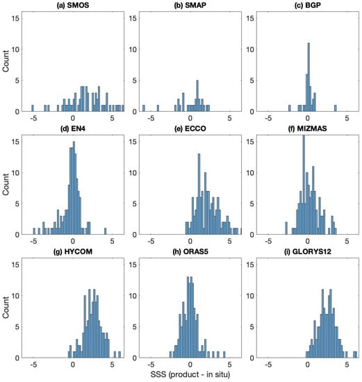 Histograms of sea surface salinity (SSS) differences (psu) of products minus in situ (SIZRS). SIZRS at 2-m is used for (a,b) Satellites, and 5-m for (c,d) in situ and (e–i) models. Bin widths are 0.2 psu.