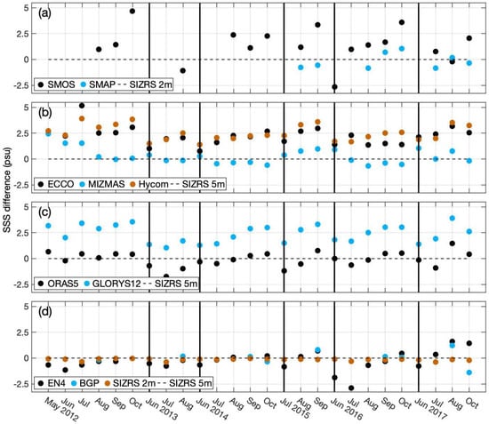 Sea surface salinity (SSS) differences (psu) from SIZRS (at 5 m) averaged along (150°W from 70.5°N–80.5°N) compared to (a) satellite missions, (b,c) ocean model simulations, and (d) in–situ observations. Grey, vertical lines separate years where months are not consecutive.