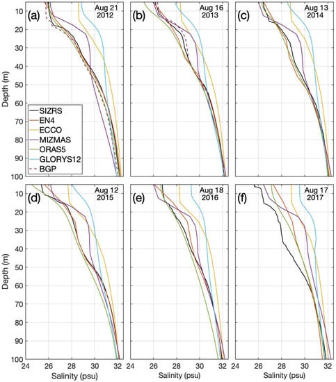 Salinity (psu) depth profile comparisons of SIZRS drops with other products over the transect average (150°W, 70.5°N–80.5°N) during (a) 21 August 2012, (b) 16 August 2013, (c) 13 August 2014, (d) 12 August 2015, (e) 18 August 2016, (f) 17 August 2017.