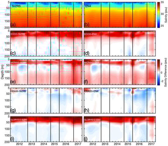 Salinity contours from SIZRS and EN4 (Figure 10a,b) illustrate the vertical salinity structure of monthly averages at all SIZRS drops. With small exceptions, these two in situ products are very similar, with low salinities (~26 psu) above 25 m and showing salinities reaching 31 psu by 60 m. ECCO and GLORYS12 showed relatively higher salinity (over 2 psu) in the surface layer, but their differences with respect to SIZRS and EN4 sharply decreased below 60 m. MIZMAS showed salinities close to in situ values at the surface, but higher biases occurred between the 10 m and 50 to 60 m depth layers. Unlike other models, MIZMAS simulates higher salinities with 0.5–1 psu differences below 100 m depth. ORAS5 depth-profiles are overall very similar to SIZRS and EN4 but are slightly (higher) lower in 2017 when compared to SIZRS (EN4).