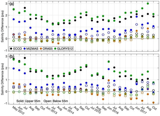 Differences in salinity (psu) depth profiles of each product at each SIZRS latitude averaged monthly from 2012–2017 separated by vertically-averaged (solid dot) upper 5 m to 55 m region and the (opened dot) lower 55 m to 207 m region for (a) model minus SIZRS, and (b) model minus EN4.