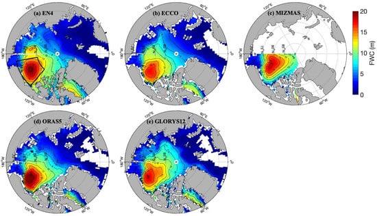 Freshwater content (FWC; m) from 5 m–500 m depth in the Arctic Ocean and averaged between 2012–2017 from the (a) EN4 data and five models: (b) ECCO, (c) MIZMAS, (d) ORAS5, and (e) GLORYS12. FWC is contoured every 2 m with a reference salinity of 34.8 psu. Beaufort Gyre region is outlined in a black box (Figure 12a).