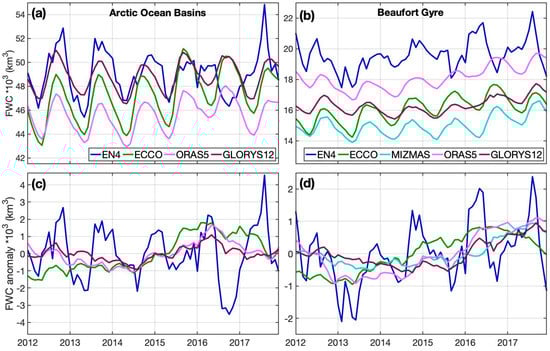 FWC from model estimations in our study also agreed with Proshutinsky et al. [] in that the BG seasonal changes of total FWC accounted for about 5% of its total volume, even for the current period, which they attribute to atmospheric circulation. EN4 estimated the FWC of the BG to be slightly higher than 22 × 103 km3 during 2017, whereas the other models except for ORAS5 (just shy of 20 × 103 km3) estimated lower than 18 × 103 km3 throughout the timeline. The largest seasonal change of FWC from the EN4 data occurred near the end of 2017, decreasing at least 4.1 × 103 km3, attributing to a departure of more than 3 × 103 km3 from its monthly BG climatologies. The 2012 FWC anomalies in Figure 13c,d for the BG are slightly smaller, but similar to estimates shown by Rabe et al. []. However, these slight differences from Rabe et al. [] can be credited to the use of a different model and their reference salinity of 35 psu instead of our 34.8 psu. The products do not show as great a seasonal difference in FWC as in their annual averages in the Arctic basin. The overall trend of FWC for the Arctic Ocean had relatively stabilized in the decade following 2010, between the relative balance of the BG freshening and the reduction of FW in the rest of the Arctic Ocean, especially in the Eurasian Basin, which Morison et al. [] attributes over the long term to the changes in surface circulation governed by the positive shift of the Arctic Oscillation in recent decades [].