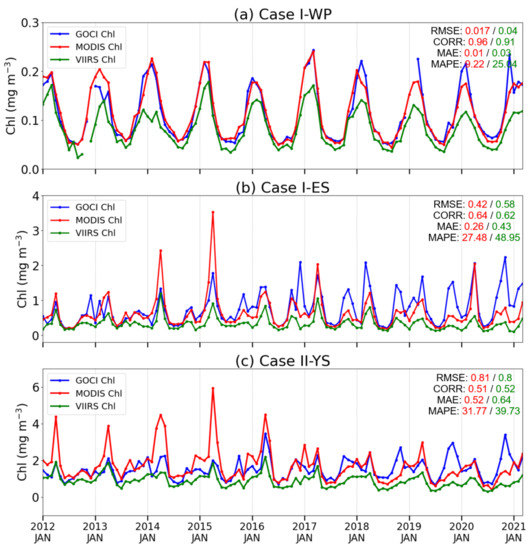 Time series of chlorophyll-a concentrations for the GOCI (blue), MODIS (red), and VIIRS (green) in the selected areas of (a) Case I-subtropical Western Pacific (WP), (b) Case I-East Sea (ES), and (c) Case II-Yellow Sea (YS), as shown in Figure 3d. The inter-comparison statistics between MODIS (VIIRS) and GOCI are in a red (green) font at the upper-right corner.