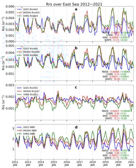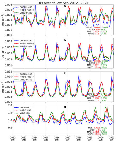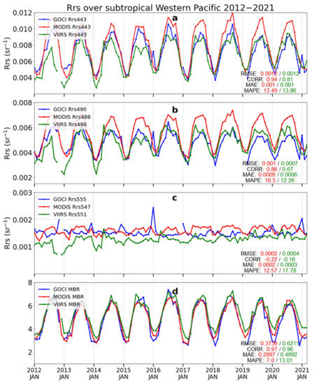 Time series (2012–2021) of remote sensing reflectances (Rrs) for the GOCI, MODIS, and VIIRS in the selected area of the subtropical Western Pacific in the (a) blue #1, (b) blue #2, and (c) green bands, and (d) maximum ratio of blue to green bands (MBR).