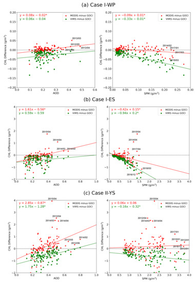 Scatterplots of inter-satellite Chl-a differences (MODIS-GOCI for red; VIIRS-GOCI for green) versus aerosol optical depth (AOD) in the left panels or suspended particular matter (SPM) in the right panels from the GOCI: Case I-WP, Case I-ES, and Case II-YS. The linear regression analysis results with slopes and intercepts between the Chl-a differences and AOD (SPM) are in the upper left corner of the left (right) panels. * indicate significant value with a 95% confidence level.