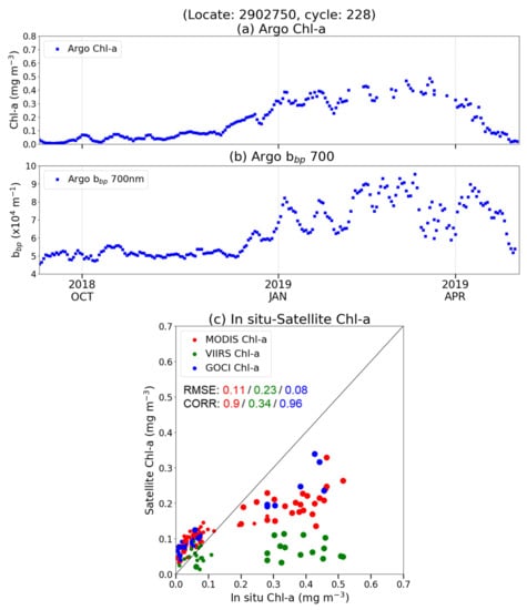The Argo observation shows stationary Chl-a and bbp in fall, with the increasing trend in winter and the maximum in the early spring, which well represents the climatological seasonal bloom in Figure 3 and Figure 11a. Although the uncertainties in Chl-a exist both in Argo and satellite data, the GOCI well reflects the seasonal phytoplankton bloom in winter to spring (the highest correlation and the lowest RMSE with Argo, Figure 12c). By contrast, the VIIRS is not good at representing the seasonal phytoplankton bloom in this region.