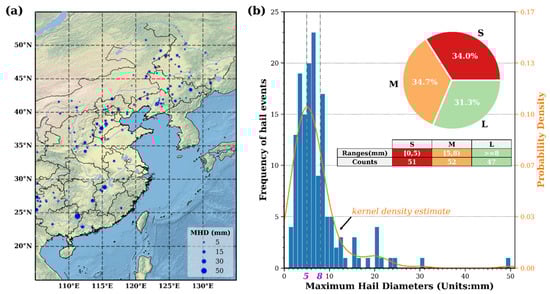 Hailstorms are severe convective weather systems commonly seen in the spring and summer. Hail is precipitation produced by hailstorms in the form of balls or irregular lumps of ice. Hailstones can be dense, minor, or giant [,]. By convention, hail has a diameter of 5 mm or more, and smaller particles of similar origin are classed as either ice pellets or snow pellets. Nevertheless, we do not exclude ice/snow pellets when analyzing hail, and for convenient description, we refer to particles smaller than 5 mm as “small hail” in this study. Being one of the most hazardous weather, hail causes massive damage to residential, commercial, and agricultural properties each year worldwide. Moreover, many studies show that hail damage caused by climate change is constantly increasing [,,,,,].