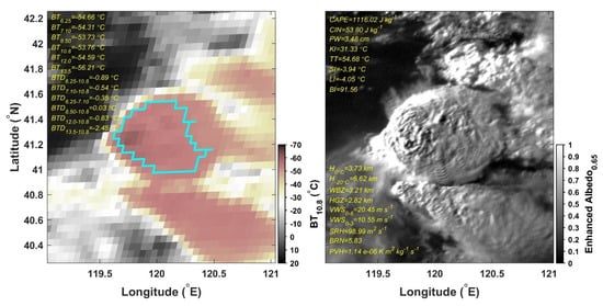 Figure 3. The satellite images showed a hailstorm sample at 09:53 (UTC) on 6 June 2018. The left image is the 10.8 μm channel image, and the cyan polygon draws the identified boundary of the hailstorm. The right image is the 0.65 μm channel image which is enhanced to display the texture of the cloud top. The yellow texts in both images record the 29 features of this hailstorm sample. - Feature selection: This step employed a PCA technique [,] to select appropriate features to train the machine learning model. The input to PCA is the matrix , where , and , representing the mean and variance of . After PCA calculation, the output is the principal component matrix:where is the coefficient matrix and is the element. The percentage of total variance explained by each principal component (PC) descends from to . The first two PCs explain more than half of the variance, so only is used to select features. As shown in Equation (1), a PC is a linear combination of feature vectors, and the coefficient of each feature vector represents its contribution to the PC. The larger magnitude of the coefficient is, the more significant contribution of the feature vector could make. Thus, we can select features that differ among hail samples by checking whether they have a larger magnitude of coefficients or not. is the applicable criteria of this study, where is the absolute value of , 0.2 is about two-thirds of the coefficients’ magnitude range. Since the hail samples have different MHDs, it inferred that the relations of hail sizes with the selected features are closer than those of the unselected ones.