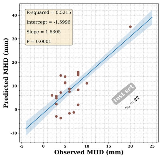 Linear fitting of predicted vs. observed MHDs on the test set. The sample size is 22 (). The text box at the top left displays the R-squared, the intercept (Intercept) and slope (Slope) values, and the P-value that indicates the confidence interval is 95%.