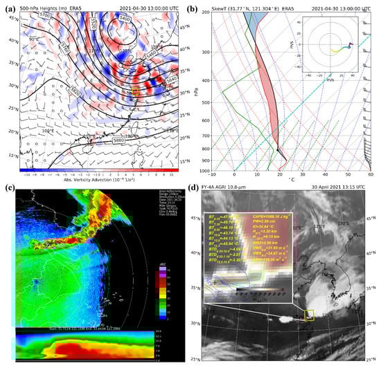 Hail event (red cross) occurred at about 13:14 (UTC) on 30 April 2021, in Chongming District, Shanghai, China: (a) 500 hPa weather map; (b) SkewT near hail event; (c) radar reflectivity; (d) FY-4A 10.8 μm image, the inset image shows the hailstorm sample (Figure 3a) that was to calculate MHD. The yellow rectangles in (a,d) represent the same geographic range.