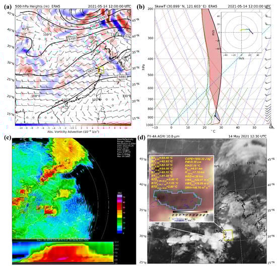 Hail event (red cross) occurred at about 12:30 (UTC) on 14 May 2021, in Fengxian District, Shanghai, China: (a) 500 hPa weather map; (b) SkewT near hail event; (c) radar reflectivity; (d) FY-4A 10.8 μm image, the inset image shows the hailstorm sample (Figure 3a) that was to calculate MHD. The yellow rectangles in (a,d) represent the same geographic range.