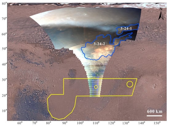 The MoRIC mosaic on March 24 and the two dust storms 3-24-1 and 3-24-2 (blue polygons in the north). Due to the quality and range limitations of the MoRIC mosaic, dust storms may not be fully displayed and identified. The yellow polygon and yellow circles show the tentative landing area and the two landing ellipses of the Tianwen-1 mission.