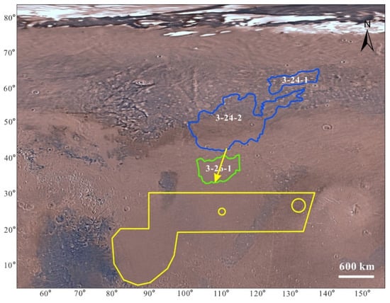 - Tanaka, K.L.; Robbins, S.J.; Fortezzo, C.M.; Skinner, J.A.; Hare, T.M. The digital global geologic map of Mars: Chronostratigraphic ages, topographic and crater morphologic characteristics, and updated resurfacing history. Planet. Space Sci. 2014, 95, 11–24. [Google Scholar] [CrossRef]