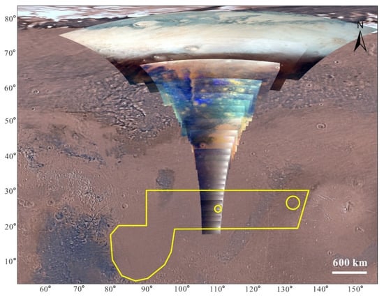 MOC consists of three cameras, a narrow-angle (NA) monochromatic visible system (500–900 nm) with a maximum resolution of 1.4 m/pixel, and two wide-angle (WA) cameras with red and blue band passes aboard the MGS [29]. The WA red images (580–620 nm) have a maximum resolution of 230 m/pixel. Set with two UV (260 and 320 nm) and five visible filters (425, 550, 600, 650, and 725 nm) aboard the Mars Reconnaissance Orbiter (MRO), the Mars Color Imager (MARCI) is a wide-angle push-frame imager, which takes about 13 sets of pole-to-pole image swaths on a daily basis, with a resolution of about 1 km/pixel at nadir and about 4 km/pixel at the limb [30].