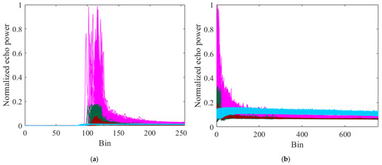 - T bins of a waveform including negative echo powers (seen in Figure 4) and higher powers than the limited maximum value (1010 W) of SWIM is removed.
