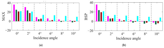 - Echo waveform energy and power: MAX and BSP. The MAX and BSP of every category decrease as the incidence angle increases. The features are distinctly divided into two cases. For the MAX values for incident angles of 0–2°, TI > FYI > SW > MYI, and for incident angles of 4–10°, SW > TI > MYI > FYI. At 0°, the sea ice BSP is higher than that of sea water except MYI, and between 2–10°, the sea water BSP is greater than that of sea ice, which agrees with the surface roughness. The FYI and MYI also reflect the consistency of the surface characteristics. Nevertheless, the TI always maintains a higher power among sea ice types, which may be due to the TI combined with the nilas and the young ice and exhibiting composite characteristics.
