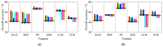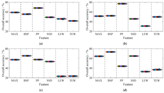 At 0–2°, all six features are effective for sea ice classification. Only MAX, PP and TEW at 2° can separate FYI and MYI at the level of some separability. At 6–10°, the six features cannot separate TI and MYI. The MAX, BSP, PP and SSD are only slightly useful for discriminating sea ice types. Only the BSP at 10° can separate FYI and MYI. LEW has worse discrimination capability than the analysis of the other waveform features. At 4°, all features perform worse in sea ice classification. As the transition between 0–2° and 6–10°, the waveform features at 4° have difficulty reflecting sea ice and sea water characteristics. It is suggested that the three incidence sets have different discrimination abilities to agree with the waveform analysis. Therefore, a single feature has a separation ability for sea ice types and sea water, and multifeature combinations are further studied.