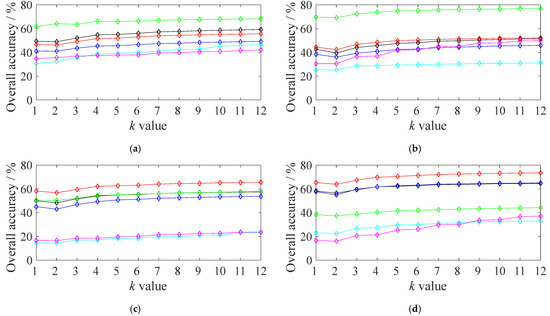 The value range of k is set to 1 to 12, which is used to classify the new sample. MAX, PP, and TEW are used to set the KNN and classify sea ice types based on the altimeter echo waveform [13]. Nevertheless, the properties at 2–10° differ from those at 0°. Thus, all features are used to set the KNN and SVM. The values of k are tested from 1 to 12 based on the Euclidean distance, as shown in Figure 9. The overall accuracies of the six features clearly increase with the k values. All features are stable after k = 5 except TEW, which begins to vary little when k = 11. It is indicated that the TEW depends on the value of k. Considering the overall classification accuracies of all the features at the six incidence angles, the value of k should be set to 11.