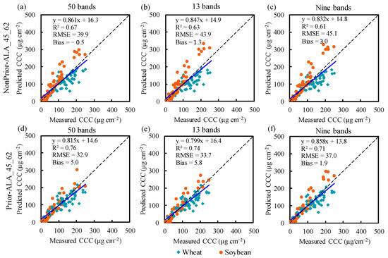 Scatter plots of the ground-measured and predicted CCC based on the RFR model using continuous and discrete spectra. Above: results of NonPrior-ALA_45_62 model using (a) 50 bands, (b) 13 bands, and (c) nine bands. Below: results of Prior-ALA_45_62 model using (d) 50 bands, (e) 13 bands, and (f) nine bands.