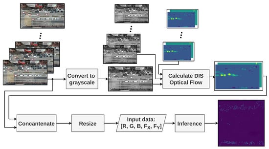The output of the above algorithm is dense optical flow matrices providing information about the motion of objects in both the x and y axes. We exploited these features as extra information by concatenating them alongside the RGB image as additional channels. The DIS values need to be calculated for each image in sequence as a part of the data preprocessing function. We provided a graphical interpretation for the example sequences in Figure 3.