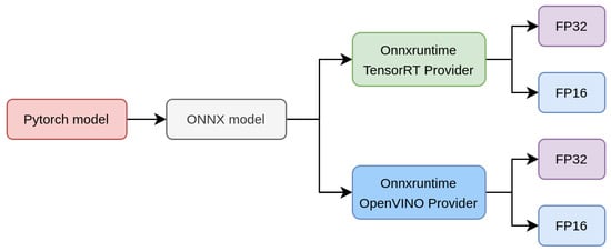 Initially, only the three increasingly complex encoder architectures (ResNet18, ResNet34, and ResNet50) were tested with three neural network architectures (DeepLabV3+, UNet, and UNet++). Since the UNet-based versions consistently offered good processing speed vs. accuracy trade-off across all variants, additional UNet and lightweight encoder variants that were developed with the application on mobile devices were tested in addition to the aforementioned ResNet encoders. A detailed description of the full set of experiments is given below, assuring the ability to use the converted embedded devices for on-board processing. For this reason, we have conducted a series of measurements on popular hardware setups. The model architecture and weights were converted from the PyTorch format to an Open Neural Network Exchange (ONNX) [] representation (using OPSET (ONNX runtime groups layers compatibility and specific version standards into operator sets called OPSET.) 11), which allows high portability between platforms. Next, we used the ONNXRuntime framework (ver. 1.10.0, Linux Foundation, San Francisco, CA, USA) [], which provides inference using device native libraries: TensorRT (ver. 8.0.1.6, NVIDIA, Santa Clara, CA, USA) for the Jetson NX and OpenVINO (ver. 2021.4.2, Intel, Santa Clara, CA, USA) for the MYRIAD device. The conversion pipeline is illustrated in Figure 5.