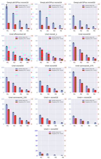The model performance visualisation (given in frames per second) for various resolutions and both devices NVIDIA Jetson NX (left scale, blue) and Raspberry Pi4 + NCS2 (right scale, red). R1–R4 represent the following input sizes: 480 × 288, 640 × 384, 960 × 540, and 1280 × 736.