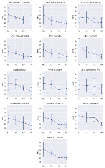 A series of experiments were performed to investigate the accuracy achieved by all the models and configurations. The range of configurations included various model structures, encoder backends, and input resolutions. Basic and mosaic augmentation was used for all the cases. Models input tensors contained five channels images: three colour channels and two optical flow channels. Table 4 reports the metrics achieved in our research. To obtain representative results, we used five-fold cross-validation. Figure 7 illustrates the changes in the MAE metric with the increase in model input resolution. The number of folds was not increased beyond that, since it would reduce the size of the validation set too much.