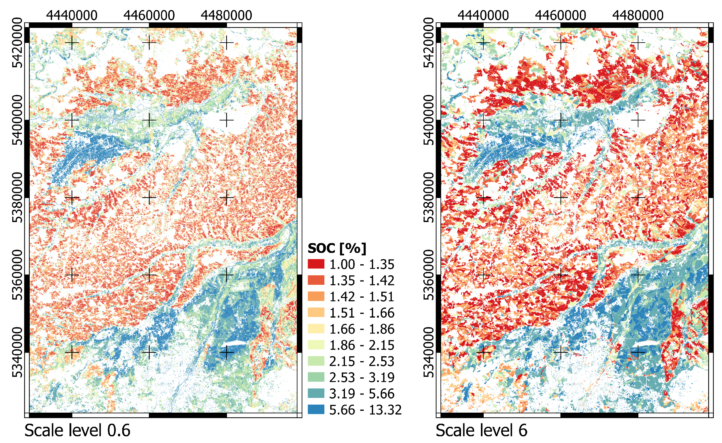 - There are scale-specific dependencies between the representativeness of the soil samples and the explanatory power of the variables used.