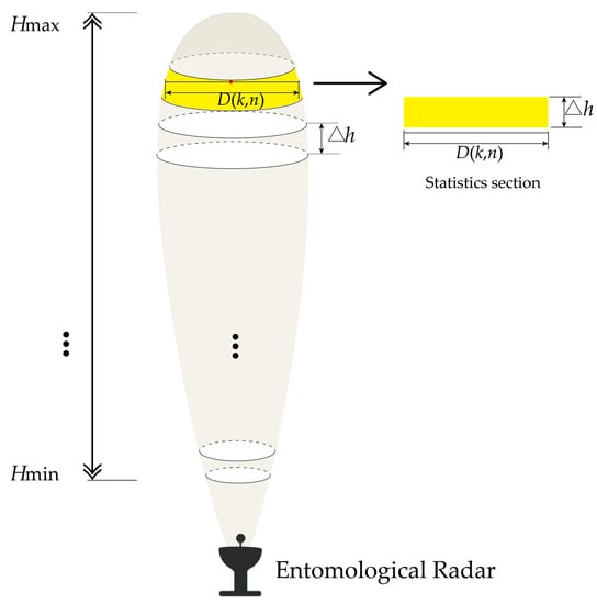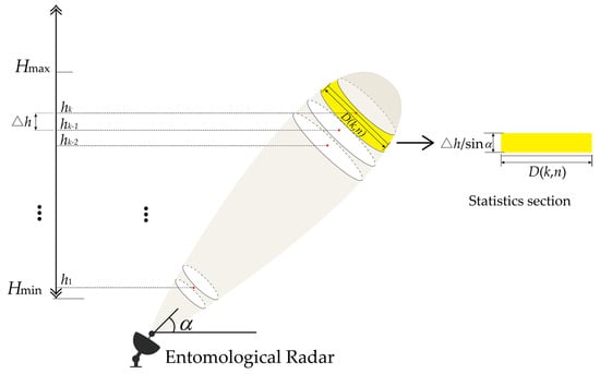 The number of insects detected by the radar in the k-th height layer and the n-th time gap is represented as , and the minimum statistical unit is represented as (k, n). Assuming that the insect flies over the beam horizontally, the length of the detectable trajectory of the i-th target in the corresponding statistical unit is defined as . As migration flux represents the number of insects crossing the unit area per unit time, the contribution of one insect to the migration flux could be calculated as: