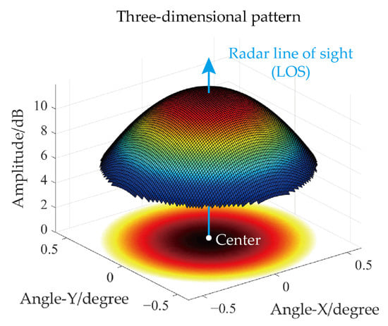 where is the radar system gain coefficient, and it is determined by the entomological radar hardware [1,16]. is the insect’s measured RCS in point . is the set minimum SNR for the detection threshold. is the antenna gain pattern. Assuming that the radar’s antenna pattern is in Gaussian shape, which can be written as: