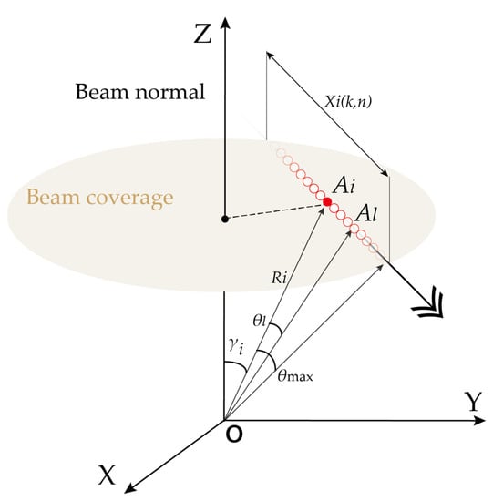 In order to simplify the calculation, the beam of the radar is still divided into several equal segments along the range dimension, as shown in the yellow area in Figure 6. The height of each segment can be calculated as . Similar to the vertical-looking mode, take the altitude of the center of the segment as the altitude of the segment.