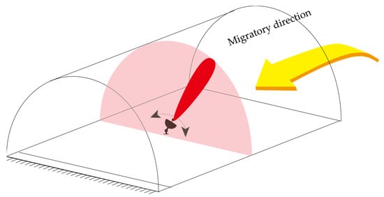 The migratory insects are expected to fly in a straight, steady line due to the need to maximize flight efficiency [3,11]. Most migratory insects can be covered when the radar beam scanning direction is perpendicular to the migrating direction. Therefore, to detect as many targets as possible, the azimuth angle of the radar could be set perpendicular to the migratory direction, and the beam is set to scan periodically in elevation. The scanning schematic is shown in Figure 7.
