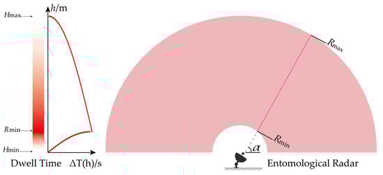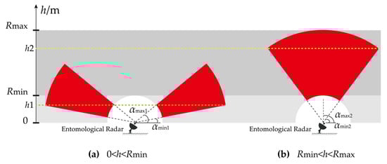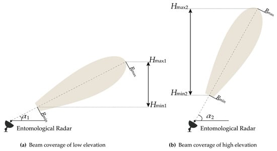 For the proposed scanning mode, the beam coverage time at different heights is different. Now, we describe how to calculate the beam coverage time at different heights during a scanning cycle. The scanning range in elevation of one scanning period is elevation from to . Most entomological radars are pulsed radar systems, with non-zero . As shown in Figure 8, when the radar elevation is , the detection height range is . When elevation is , the detection height range becomes , where . It is easy to represent the two height ranges with the detection ranges as and . Since , for the larger elevation , the radar covers a larger altitude range.