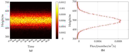 Migration flux measured under fixed-beam arbitrary pointing mode. (a) Migration flux with height-interval = 25 m, and time-interval = 600 s; (b) Height-average flux profile.