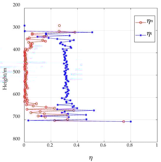where and are the real flux and the measured flux at k-th height segment, respectively. According to the previous calculation results, the of the traditional flux calculation method and the proposed flux statistical method are recorded as and . The comparison results are shown in Figure 15. is mostly concentrated between 0.2 and 0.4, which indicates that, if the positions of the insects passing through the beam are not considered, it will cause about 30% measurement error.