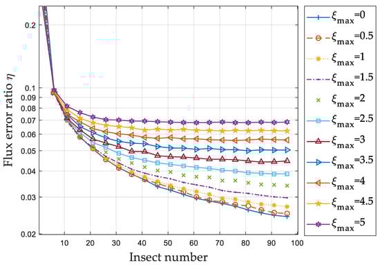 is mostly less than 0.2. At a height of 400~600 m, where the number of insects is large, is even less than 0.025, which means that at this height segment, the migration flux measurement is very close to the real migration flux. The large number of insects at 400~600 m is caused by the assumption of the simulation that the insects are concentrated at 500 m, and obey the normal distribution. Therefore, the insects are mostly concentrated between 400~600 m, and there are relatively few insects in other height segments. The simulation results show that the larger the number of statistical samples, the smaller the error of the migration flux calculation results.