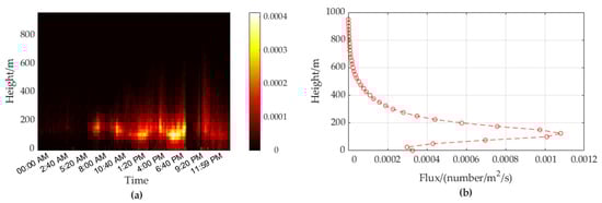 The migration flux results calculated based on the proposed method are shown in Figure 14a, where 5 m and 60 s. The height-average flux profile over 12 h is shown in Figure 14b. It can be seen that this result is close to the theoretical migration flux, shown in Figure 12.