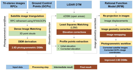 An overview of our processing pipeline is shown in Figure 1. Starting from raw satellite tri-stereo images (described in Section 2.1), we first perform an RPC bias compensation with GCPs followed by 3D reconstruction to obtain a DSM for each stereo pair (Section 2.2). A high resolution Lidar DTM is available in the area, therefore, the resulting DSMs could be improved by means of the global Least Squares Matching (LSM) technique in object space (Section 2.3.1). In this step, an elevation correction function is also determined by using the continuous LSM technique. The image correction functions are computed based on point re-projections (Section 2.3.2) and finally the corrected images and GCPs are employed as input for a new photogrammetric workflow, resulting in satellite-based DSMs with an improved quality.