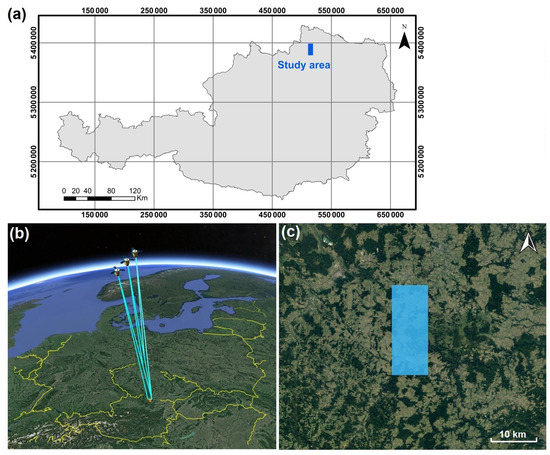 Satellite image acquisition for the study area: (a) Overview map of Austria with marked location of the study area (coordinates in UTM zone 33N). (b) Pléiades tri-stereo acquisition geometry (view of satellite positions in Google Earth). (c) Acquisition footprint visualized in Google Earth.