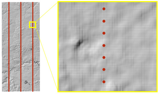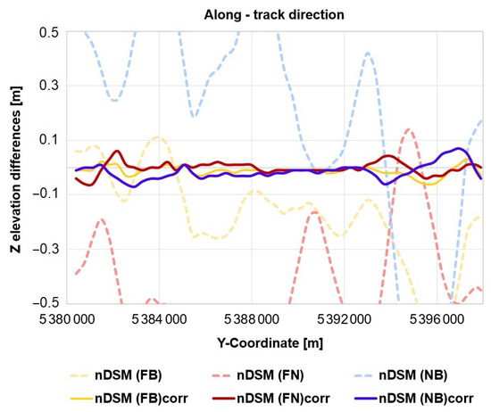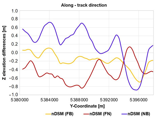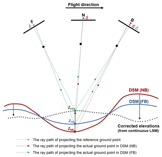 Thirdly, the image geometry corrections are determined by adopting a “from object to image space” re-projection procedure. The image correction starts with the extraction of 3D point profile lines. The selected points are distributed in three parallel lines at 10 m intervals along the flight direction. In total, the 2D positions (latitude, longitude) of 5583 points (1861 in each line) are defined (Figure 5). Their corresponding elevations (Z) are extracted from the photogrammetric satellite-based pairwise DSMs (FB, FN, NB) and the corrected elevations are computed using the function of Z differences resulting from the LSM-continuous approach with the following formula (for an object point with coordinates ):