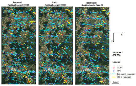 Image re-projection errors of the 43 GCPs and 373 TPs in the Allentsteig dataset based on bias-corrected RPC orientation. Overview of scaled image residuals in Forward, Nadir and Backward images. The vectors were exaggerated 5000 times to enable better illustration.