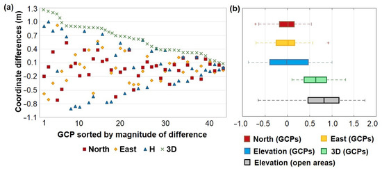 The accuracy (in planimetry and elevation) of the satellite-based DSMs was evaluated by comparing the GCPs’ coordinates (measured either on the ground or on orthophoto and Lidar) with those monoscopically measured on the oriented satellite images in a multi-image view-mode. The summary of the resulted statistics for the coordinates are then visualised with boxplots.