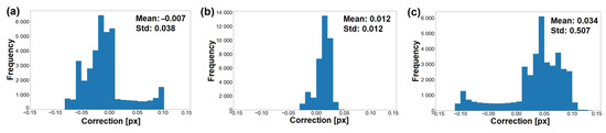 where the mapping function remains constant in the column direction (which for Pléiades corresponds nearly to X-East direction), while the defines the image correction function model for displacements in the row direction (corresponding to Y-North direction). This function is sampled over the final average correction model (Equation (9)) with a pixel spacing on the ground of approx. 10 m/0.7 m.