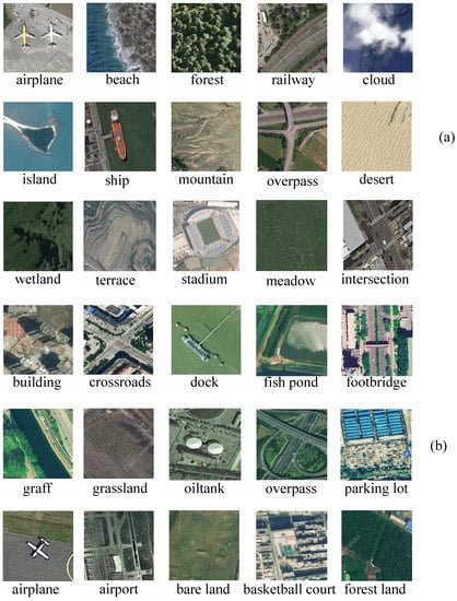 Samples from different datasets. (a) NWPU-RESISC45, (b) RSD46-WHU.