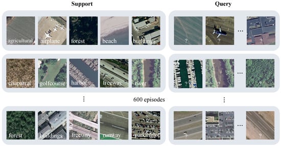The RSD46-WHU is an open dataset for remote sensing scene classification. There are 117,000 images divided into 46 classes of scenes in the dataset, each with 500–3000 images of 256-pixel size. On the basis of [32], we separated it into three sections: 26 classes for meta-training, 8 classes for meta-validation and 12 classes for meta-testing. The specific information is shown in Table 1.